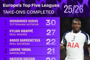 體育資訊10月17日訊 根據本賽季歐洲五大聯賽的數據統(tǒng)計,熱刺球員庫杜斯以30次成功過人領跑該項數據榜,皇馬前鋒姆巴佩以27次緊隨其后。