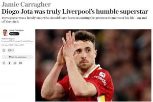 他如此年輕便被奪去生命,令人痛心。他將被數(shù)百萬利物浦和葡萄牙球迷銘記為英雄,他們都需要時間來接受這個殘酷的現(xiàn)實(shí):他再也沒有機(jī)會創(chuàng)造更多精彩的足球回憶,也無法再次聽到他為觀眾帶來多少歡樂的回響。