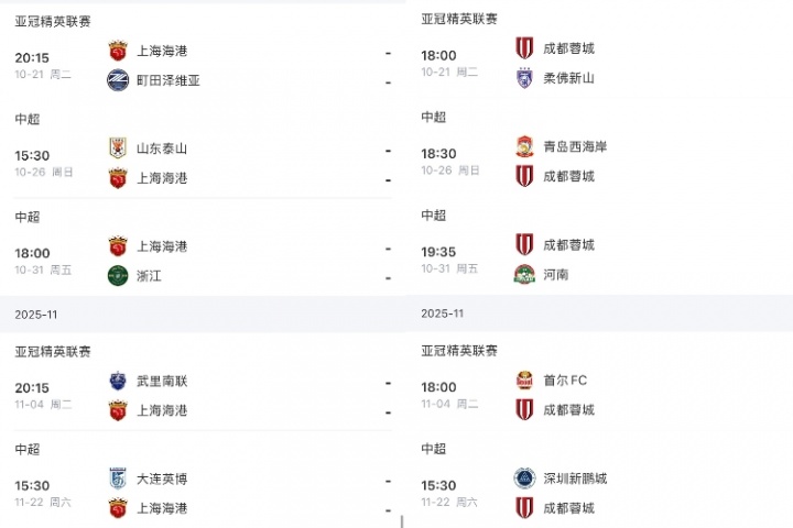 體育資訊10月17日訊 中超還剩最后3輪,海港、蓉城、申花剩余賽程如下。