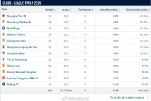 俱樂(lè)部總身價(jià)方面,上海海港B隊(duì)以159萬(wàn)歐元排名第一,山東泰山B隊(duì)以157萬(wàn)歐元排名第二,廣西恒宸以146萬(wàn)歐元排名第三,無(wú)錫吳鉤以143萬(wàn)歐元排名第四。