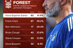 根據(jù)數(shù)據(jù)統(tǒng)計(jì),努諾是森林隊(duì)史英超勝率最高的主帥。努諾率隊(duì)出戰(zhàn)62場(chǎng)英超比賽,勝率達(dá)到了41.9%。上賽季努諾率隊(duì)拿下英超第7,獲得歐聯(lián)杯資格。