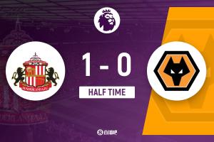 上半場比賽結(jié)束,桑德蘭1-0狼隊。