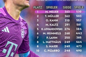 體育資訊10月19日訊 德甲第7輪比賽,拜仁在安聯(lián)球場以2-1的比分力克多特笑傲國家德比。本場比賽,拜仁門將諾伊爾迎來自己第530場德甲比賽,而他也取得了第363場勝利,這讓他超越穆勒成為德甲勝場數(shù)最多球員。
