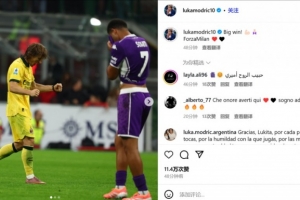 莫德里奇曬出了自己的賽場(chǎng)照,配文寫(xiě)道:“偉大的勝利!Forza Milan?!?/p>