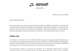 如你們所知,西班牙足球裁判協(xié)會(AESAF)的根本宗旨之一,就是維護西班牙裁判集體的利益,保障他們無論是在集體層面還是個人層面的榮譽、完整性和聲譽。在此背景下,由你們?nèi)w一致選舉產(chǎn)生的AESAF管理委員會,一直在司法層面評估幾個與我們相關的懸而未決的案件。