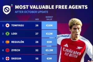 體育資訊10月21日訊 德轉(zhuǎn)更新自由球員身價排行榜,富安健洋1600萬歐居首,雷吉隆、齊耶赫、帕科位居前十位。