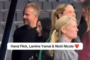 亞馬爾的女友妮基-妮可來到現(xiàn)場(chǎng),為男友助威,巴薩主帥弗里克賽后與亞馬爾、妮基-妮可交談,三人都面帶笑容。