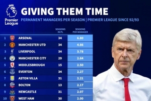 體育資訊10月22日訊 《轉(zhuǎn)會市場》統(tǒng)計了英超各隊的歷任主教練平均執(zhí)教年限情況,阿森納無懸念居首。