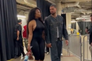 賽后,克萊手牽手?jǐn)y女友馬冬梅離場。