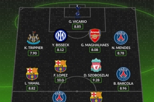 中場(chǎng):亞馬爾(巴薩,8.82分)、費(fèi)爾明(巴薩,10分)、索博斯洛伊(利物浦,9.28分)、巴爾科拉(巴黎,8.96分)