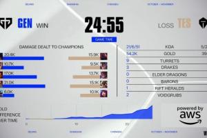 體育資訊10月23日訊 2025全球總決賽瑞士輪Round4,GEN首局用時24分55秒速通TES,距離本屆S15最短對局僅差5秒。