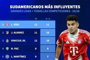 體育資訊10月24日訊 德國轉(zhuǎn)會市場統(tǒng)計了本賽季五大聯(lián)賽南美球員的參與進球數(shù)量,并列出榜單,路易斯-迪亞斯參與11球居首,阿爾瓦雷斯、維尼修斯參與10球次席。