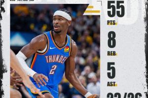 本場比賽,雷霆當(dāng)家球星亞歷山大一展雙MVP風(fēng)采,攻防俱佳,戰(zhàn)力十足,末節(jié)&加時(shí)頻頻取分,砍下生涯新高的55分&罰球數(shù)生涯新高26記,同時(shí)成為本賽季全聯(lián)盟首位50分先生!