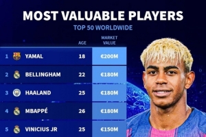 體育資訊10月25日訊 德國轉(zhuǎn)會市場列出了球員身價(jià)前50排名,亞馬爾2億歐居首,貝林厄姆、哈蘭德、姆巴佩1.8億歐次席。