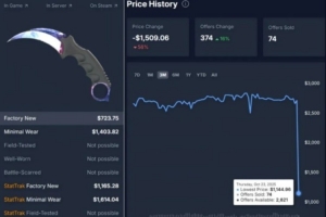 比如先前市場上較貴的武器飾品之一爪刀多普勒(Karambit Doppler),據(jù)CSGOSKINS平臺顯示,其價格從2700多美元驟跌到了1100多美元。