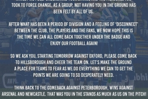 所以我們請求你們,從明天對陣牛津聯(lián)的比賽開始,請回到希爾斯堡球場為球隊加油助威。讓我們把這座球場變成客隊恐懼的地方,因為我們將竭盡所能去爭取我們?nèi)绱似惹行枰姆e分。
