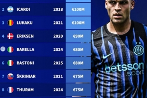 體育資訊10月25日訊 本輪意甲焦點戰(zhàn)將在國米與那不勒斯展開。德轉(zhuǎn)也盤點了兩隊隊史身價榜,具體如下:
