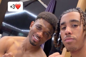 約羅也在賽后通過社媒曬出自己和阿瑪?shù)略谫惡蟾率页嗦闵习肷淼淖耘恼眨瑑扇丝雌饋矶枷喈?dāng)開心,約羅還配文道:“+3分”。