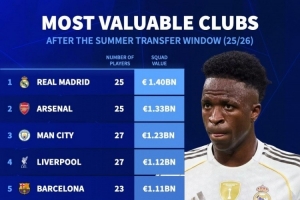 關(guān)窗后球隊(duì)身價(jià)排名:皇馬14億歐居首,槍手、曼城前三&曼聯(lián)第10